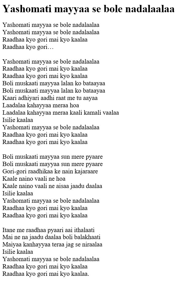 Yashomati mayyaa se bole nadalaalaa